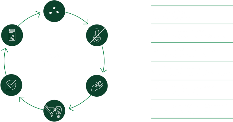 Our processing temperature always stays below 48°C. We use just the right amount of heat under high vacuum to extract moisture, preserve the active ingredients, shorten drying times, and protect sensitive phytonutrients. The EnviroSimplex® method liquefies and mixes all raw materials in a special chamber where the bio-activation process occurs, allowing enzymes, probiotics, and prebiotics to culture the ingredients. The whole process is free of solvents and ethanol.
